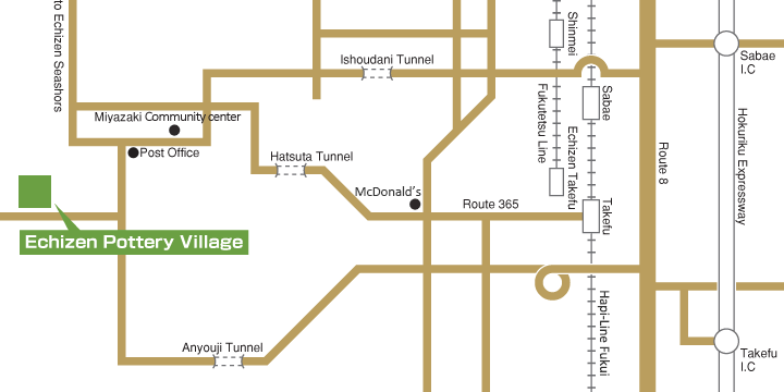 BusGet off at Hapi-Line Fukui Takefu Station and walk for a few minutes to the Takefu-ekimae bus stop to take a bus for Ota on the Takefu/Echizen-kaigan line about 30 minutes to the Togeimuraguchi bus stop. [ Bus service time table ] Takefu-ekimae -> Togeimuraguchi [NAVITIME] Togeimuraguchi -> Takefu-ekimae [NAVITIME] Get off at Fukutetsu Shinmei Station and walk to the Shinmei-eki bus stop to take a bus for Kashizu/Ota on the Seiho line about 30 minutes to the Togeimuraguchi bus stop. [ Bus service time table ] Shinmei-eki -> Togeimuraguchi [NAVITIME] Togeimuraguchi -> Shinmei-eki [NAVITIME] Expressway